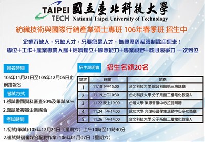 「國立台北科技大學分子科學與工程系暨有機高分子所紡織技術與國際行銷產業碩士專班」春季班招生海報。圖/翻攝自該產碩班官網