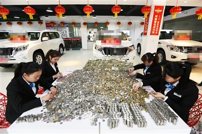 【本報綜合報導】騰訊新聞報導,中國大陸1位郭姓男子與家人,24日開車到河南鄭州北環的豐聯進口車店,聲稱要購買一輛豐田霸道(prado越野車,市價約200多萬新台幣);張姓汽車銷售員表示,「他選好車子之後,就問我們要不要零錢?」原來這位郭先生在其他店內詢問過,都不願接收零錢。