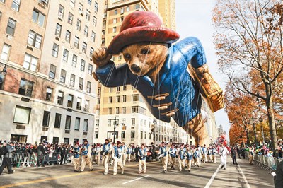 第九十屆梅西感恩節大遊行二十四日在紐約市曼哈頓中城登場,超過三百萬觀眾將周遭街道擠到水洩不通,在場內外上萬維安警力下,民眾歡樂度過感恩節。查理.布朗氣球是今年重返遊行隊伍的三個巨大造型氣球之一,其他重返的高人氣造型包括湯瑪斯小火車、凱蒂貓和海綿寶寶。圖為巨型柏靈頓熊氣球飛上天。