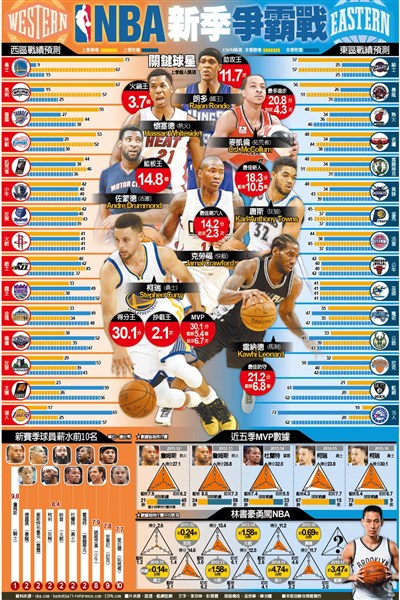 NBA2016-17球季台北時間10月26日開打,詹姆斯(LeBron James)要率領克里夫蘭騎士尋求衛冕,上季總冠軍賽被翻盤的金州勇士在「雷霆一哥」杜蘭特(Kevin Durant)加盟後,與柯瑞(Stephen Curry)聯手戰力再升級,韋德(Dwyane Wade)轉戰公牛,加索(Pau Gasol)投入馬刺,林書豪重返紐約躋身籃網主力,NBA新賽季球星版塊移動,聯盟生態更多樣,千變萬化精采可期。