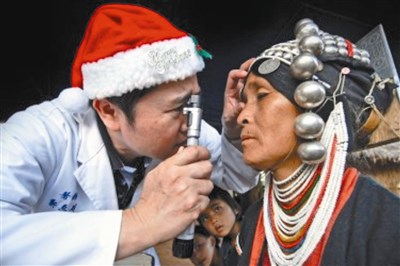 【記者陳玲芳台北報導】馬偕紀念醫院陳毓芬醫檢師「眼科義診」,耶誕節前夕前往泰北偏遠山區,阿卡族人扶老攜幼跋山涉水只為讓台灣醫師看診,照片中台灣醫師細心檢查阿卡族婆婆的白內障,與後方好奇睜大雙眼偷看的孩童,形成強烈對比。