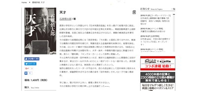 日本Oricon今早公布今年暢銷書排行榜(統計期間為2015年11月23日至2016年11月20日),石原慎太郎的小說《天才》在綜合類排名中位居榜首,估算銷量達80.5萬本。《天才》是以第一人稱描寫前首相田中角榮生涯的作品,由於石原在擔任眾議員時期一直批判田中的金權政治,他的小說以昔日政敵為主角也引發了日本國內熱議,形成一股「角榮書熱」。