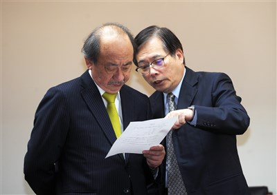 民進黨立法院黨團總召柯建銘(左)1日在立法院,出席勞基法修正草案協商會議,與勞動部長郭芳煜(右)交換意見。圖/中央社