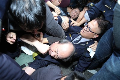 勞工團體抗議刪除7天假,民主進步黨立法院黨團總召集人柯建銘(中)現身鎮江街時,遭潑水、推倒。圖/中央社