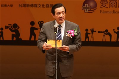前總統馬英九在台北松菸誠品,出席2016兩岸華人金媒獎暨兩岸新聞報導獎頒獎典禮,並擔任頒獎人。圖/中央社