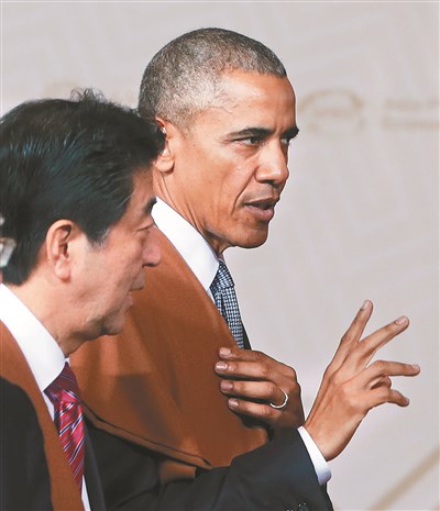 新華網發文指出,比起珍珠港,安倍(左)最該去的是南京。右為美國總統歐巴馬。圖/美聯社