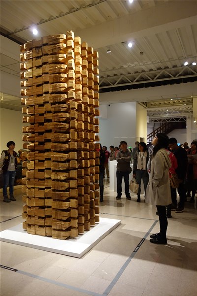 【本報新北訊】朱銘美術館即日起推出全新「探材‧拓藝:2016年朱銘典藏展」,同時呈現木雕、陶塑、海綿、不鏽鋼、光澤感應用,以及異材質組合等6種手法,而首度曝光作品〈方正人間〉是由210塊木頭堆疊,高達3.18公尺最為吸睛,象徵人群看似緊密卻疏離,值得民眾反思。