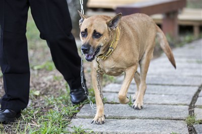 原是流浪犬的「阿文」,如今轉職成為新竹市府的「守護犬」。圖/中央社