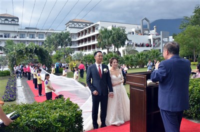 日暉國際渡假村董事長鄭越才長女鄭舜文,今天上午10時,與國內知名企業養樂多集團第三代王冠智,在日暉國際渡假村舉行「打破世界紀錄」的世紀婚禮歸寧宴。