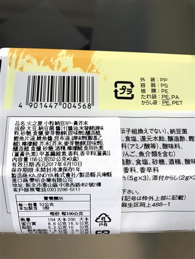 太冠公司進口「四付紅納豆」使用日本核災地區茨城縣醬油,全面下架,民眾發現羿昕公司進口的「火之屋小粒納豆」(圖/中央社)醬料也來自茨城,新光三越百貨已預防下架。
