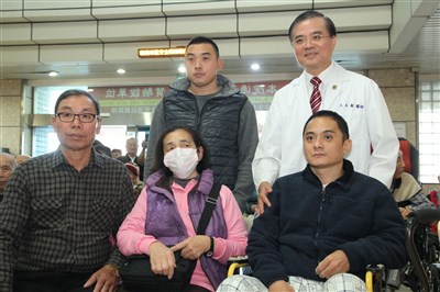 高雄榮民總醫院台南分院長王志龍(後右1)與歐東岵(前右1)一家人合影。圖/中央社