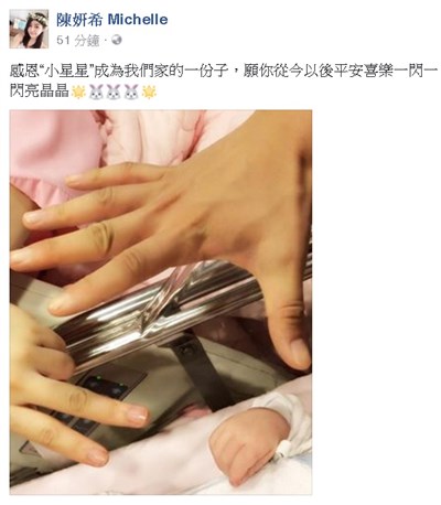 陳妍希當媽了!感恩兒子到來 |2016.12.20 語音朗讀 509觀看次 字級 大 中 小 陳妍希今天貼出一家三口手指合比「520」照片宣布喜訊。圖/取自陳妍希臉書 【本報台北訊】33歲藝人陳妍希今天在社群網站臉書(facebook)上宣布兒子誕生! 陳妍希與小4歲的藝人陳曉合作戲劇《神鵰俠侶》結緣相戀,去年結婚。陳妍希今天貼出一家三口手指合比「520」照片宣布喜訊,她寫著:「感恩小星星成為我們家的一分子,願你從今以後平安喜樂,一閃一閃亮晶晶」,粉絲紛紛留言獻上祝福。 前一篇文章 年關到 勞工紓困貸款周五申請 下一篇文章 陸網紅:台灣燈會 此生必遊旅程 熱門新聞 01與精品品牌撞鞋 印度涼鞋打專利戰2025.12.2102銀杏點亮.東京印象2025.12.2303邂逅佛教 安頓身心2025.12.2104【動物奧斯卡獎】猜猜誰最會演(上)2025.12.2105北捷英雄捨身救人 母盼菩薩接引2025.12.2306【守護家人】 為愛築家2025.12.2307社論--瞋恨的危害2025.12.2108【佛教管理學②】人間佛教的「治心十法」⑩2025.12.2109降噪耳機原理2025.12.2210數位科技與信仰交會 推播人間佛教文化2025.12.22 訂閱電子報 台北市 天氣預報 台灣一週天氣預報 相關報導 【星雲大師如是說】處事禪心【星雲大師如是說】人間佛教【星雲大師如是說】正信之美【星雲大師如是說】輪轉相繼【星雲大師如是說】有情的層次【星雲大師如是說】六忍歌
