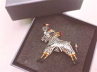 蔡爾平年輕時赴紐約深造,為賺取生活費,將雕塑縮小變成飾品,自創品牌紅遍全美。這次拿出彩鑲瓷的斑馬別針、愛神箭穿心兩件作品義賣。