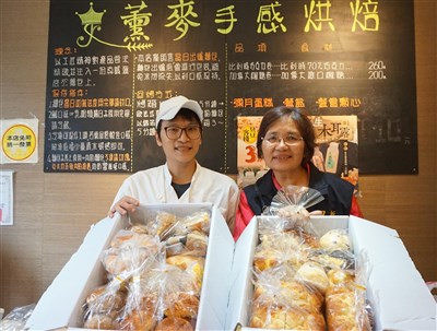 新北市中和區薰麥手感烘焙、小麥家烘焙坊,長期贊助愛心麵包,由永和民樂里長劉善珍(右)分送弱勢或社福機構。圖/中央社
