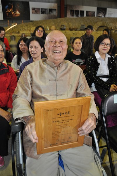 【本報苗栗訊】文化部所屬工藝中心每年頒發工藝成就獎,一年僅1人獲獎,是台灣工藝界最高獎項,今年工藝成就獎頒給苗栗縣91歲老陶師林添福,肯定林添福對台灣陶藝的貢獻,他不吝對後進傾囊相授,是「傳統陶藝界的活寶典」,苗栗縣長徐耀昌今天也頒獎肯定。