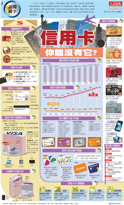 「一卡在手,行遍天下!」打開皮夾,多數人都擁有一張以上的信用卡。信用卡除了能刷卡消費,還提供預借現金,其與付現消費最大差別包括:可以先消費後付款、回饋紅利、分期優惠、提供道路救援、機場接送、免費停車等特別服務,但信用卡也存在被盜刷及使用過度「刷爆」等風險,甚或變成負債累累的「卡奴」。如何一卡在手,萬事順手,我們以一張圖,呈現它的多彩多變與如何改變人類消費習慣。