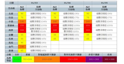 【本報台北訊】環保署空氣品質監測網站預報顯示,今日雲嘉南局部地區及高屏地區為「對所有族群不健康」,竹苗、中部及金門地區空氣品質指標(AQI)為「對敏感族群不健康」等級,其他地區為良好至普通等級;而明後兩日細懸浮微粒PM2.5濃度仍有偏高現象,雲嘉南局部地區及高屏地區將持續維持在「對所有族群不健康」的紅色警戒範圍。
