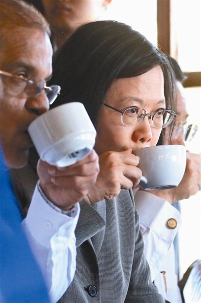 總統蔡英文(右)十三日前往薩爾瓦多阿德賴達咖啡生產合作社參訪,並與薩國副總統歐帝茲(左)一同品嘗薩國咖啡。圖/中央社
