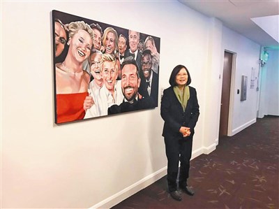 蔡英文總統過境舊金山,當地時間十四日與訪團成員一起拜訪推特公司,在「奧斯卡史上最大咖自拍照」畫像前合影留念,並開設個人英文帳戶。圖/中央社