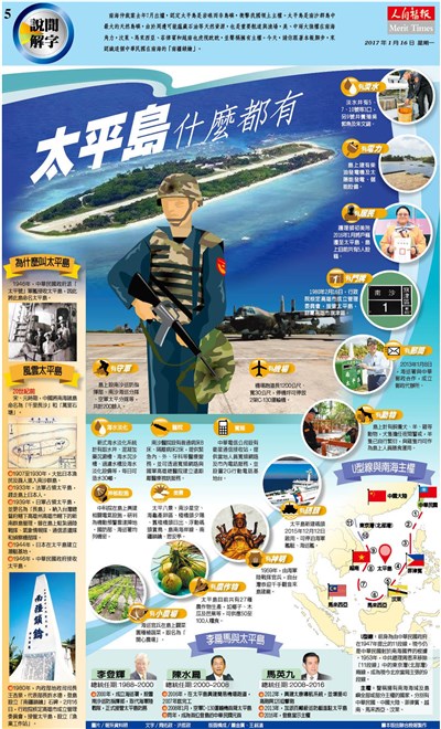太平島什麼都有 |2017.01.16 語音朗讀 1873觀看次 字級 大 中 小 太平島什麼都有 南海仲裁案去年7月出爐,認定太平島是岩礁而非島嶼,衝擊我國領土主權。太平島是南沙群島中最大的天然島嶼,由於周邊可能蘊藏石油等天然資源,也是重要航道與漁場,美、中兩大強權在南海角力,汶萊、馬來西亞、菲律賓和越南也虎視眈眈,並聲稱擁有主權。今天,請你跟著本報腳步,來認識這個中華民國在南海的「南疆鎖鑰」。 前一篇文章 新住民 過年趣 下一篇文章 減塑救海洋 人人來當不塑之客 熱門新聞 01【詩】草螟公2025.12.1802【閃文集】火星暗斑之謎2025.12.1603福建艦航經台海 空拍照首曝光2025.12.1804高雄新航線明啟動 佛光山成亮點2025.12.1705如何優雅不濺水花?2025.12.1606寶塔寺 三代同堂搓湯圓、繪燈籠2025.12.1607受星雲大師啟發 旅日名廚獲頒黃綬褒章2025.12.1608社論--改變與改變的能力2025.12.1609資助流浪漢之家 里斯本佛光人跨文化送暖2025.12.1810多倫多佛光山龍獅團 中華文化薪火相傳2025.12.18 訂閱電子報 台北市 天氣預報 台灣一週天氣預報 相關報導 大學校名怎麼來? 作者其他文章優化大腦 自我實現心理投射現象解析從潮流到商機 流行文化吸引力困境中從容轉身莫迪會見普亭 盼俄烏戰爭盡快落幕面對災厄無常 善念可化解與修復