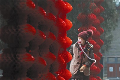 中國大陸北京市一座公園為迎接春節,掛了許多紅色燈籠,一位婦女十七日戴著自製的面罩,怕吸進太多霧霾。圖/法新社
