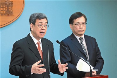 陳建仁副總統(左)與勞動部長郭芳煜(右)昨天召開「年金改革有關勞工部分說明」記者會。圖/林伯東
