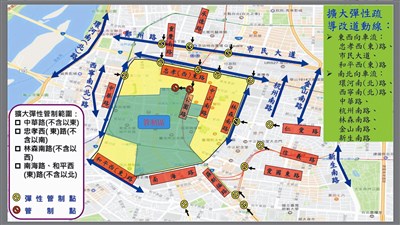 總統府周邊人車管制範圍,北起衡陽路、常德街(含))以南;中山南路、羅斯福路(不含)以西;愛國西路、博愛路(含)、南海路(不含)以北;中華路(不含)以東等區域(上圖/台北市警局提供)。