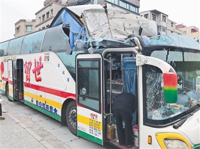 載陸客團的遊覽車撞上限高二點八公尺涵洞,遊覽車上方車頭被削了一半(圖)。圖/劉星君