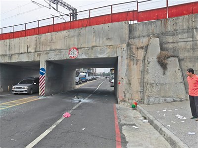 載陸客團的遊覽車撞上限高二點八公尺涵洞(圖),遊覽車上方車頭被削了一半。圖/劉星君