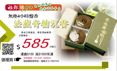 福報購專欄 |2017.02.12 語音朗讀 519觀看次 字級 大 中 小 無塵4小時盤香─法藏奇楠沉香 惠安沉香產區,香氣清幽高雅、甘醇香甜。 585 元 運費100 滿1000免運 24盤入 前一篇文章 西班牙百鈉瑞橄欖油 下一篇文章 原鄉文創美食祭 熱門新聞 01台南.佳里 蕭壠香火溯根源 紅磚古厝映流年2026.04.2702久坐看電視易失智 閱讀談話活化大腦2026.04.2803【人間行者心】日常即是佛法2026.04.2604台灣佛教總會理事長交接 佛光山祝賀2026.04.2705【看人間】縮小自己 是與朋友相處的祕訣2026.04.2806好萊塢剩食 化弱勢救命餐2026.04.2607程如晞 用敬老卡開心探索生活2026.04.2508【生活智人162】美國媒體人范德海 分享五心法 助你掌控人生2026.04.2509追思緬懷星雲大師 大馬佛青獻唱佛曲2026.04.2910印度音樂公車 填補貧童教育2026.04.28 訂閱電子報 台北市 天氣預報 台灣一週天氣預報 相關報導 以文字護持人間福報運動睡眠新科技 養生保健新利器房仲第一品牌 永慶加薪3% 體驗美好手作 製皂幸福時光 博愛社大春季班招生中 薩克斯風吹奏春季班 人間大學台中分校招生中 跨越十年縱橫南半球到北半球 《行者》新書上市