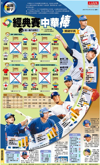 經典賽中華棒 蘇志畬、陳宛晶、吳思儀 |2017.02.13 語音朗讀 2536觀看次 字級 大 中 小 經典賽中華棒 圖片來源:報系資料照、取自網路 版面構成:蘇莉婷、王銘滄 本版由聯合晚報製作 中華隊在2013年經典賽從資格賽打起,先挺進分組預賽,又在台灣球迷面前以2勝1敗搶下分組冠軍,驚喜晉級8強,也寫下隊史最佳紀錄。 如今4年過去了,2017年經典賽即將於3月登場,分組戰場移師到南韓首爾,中華隊能否再造傳奇,勢必是大家關注的焦點。現在透過本刊帶領讀者重溫中華隊的經典戰役,進軍本屆賽事的主力球員與分組動態。 前一篇文章 千呼萬喚駛出來 機捷真的來了 下一篇文章 聽音樂會 坐哪對? 熱門新聞 01【詩】草螟公2025.12.1802【閃文集】火星暗斑之謎2025.12.1603福建艦航經台海 空拍照首曝光2025.12.1804高雄新航線明啟動 佛光山成亮點2025.12.1705如何優雅不濺水花?2025.12.1606寶塔寺 三代同堂搓湯圓、繪燈籠2025.12.1607資助流浪漢之家 里斯本佛光人跨文化送暖2025.12.1808受星雲大師啟發 旅日名廚獲頒黃綬褒章2025.12.1609社論--改變與改變的能力2025.12.1610多倫多佛光山龍獅團 中華文化薪火相傳2025.12.18 訂閱電子報 台北市 天氣預報 台灣一週天氣預報 相關報導 大學校名怎麼來?