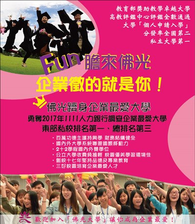 佛大2攻 |2017.02.14 語音朗讀 708觀看次 字級 大 中 小 佛大2攻 2017年1111人力銀行調查,佛光大學勇奪企業最愛大學。 前一篇文章 百鈉瑞冷壓初榨橄欖油 下一篇文章 看人間 學生伴獨老 德國住居新風潮 熱門新聞 01瑕疵品反爆紅 哭哭馬賣到缺貨2026.01.1402南亞偏鄉師參學新馬寺 交流創意教學法 2026.01.1403平價版人類洗澡機 預計年底開賣2026.01.1404日電鐵貴志站 任命第3代貓站長2026.01.1405新馬寺 佛光兒童歡喜入學禮2026.01.1306重慶川普紅不讓 談旅遊給人歡喜2026.01.1407菲律賓三好校園頒獎 129校獲表揚2026.01.1308金球獎提摩西夏勒梅封帝 蘿絲拜恩摘后2026.01.1309野森動物學校 17日試營運2026.01.1310台南林鳳營 落羽松花海2026.01.13 訂閱電子報 台北市 天氣預報 台灣一週天氣預報 相關報導 從眾生平等談民主--寫在全球民主運動大會召開之際看人間 「和平」是現代文明拼圖中不可或缺的聯合國援糧經費快見底 恐加劇葉門饑荒大陸碳排挑戰 從農業起跑跨部門協同 恢復生物多樣性植樹造林 是高成熟負碳技術