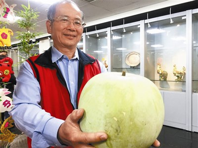 【本報南投訊】南投縣文化資產學會常務理事陳國大,去年十月種下新品種冬瓜,最近採收,但不像一般圓柱形的大冬瓜,反而像是西瓜(上圖/江良誠),只差少了一些綠色條紋,幾乎和小玉西瓜沒兩樣,「冬瓜或西瓜?」成了鄰里間的趣味話題。