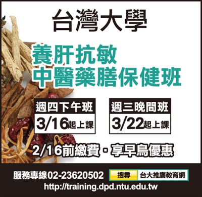台大推廣部招生 |2017.02.15 語音朗讀 558觀看次 字級 大 中 小 台大推廣部中醫藥膳保健班招生 周四下午班3/16起上課,周三晚間班3/22起上課,2/16前繳費,享早鳥優惠。 前一篇文章 妙檀香洗衣粉、洗衣精 下一篇文章 佛光山叢林學院 熱門新聞 01全中運張雅佳游泳 3 金 雙破全國2026.04.2402【走讀城鄉】淡水市街清代三合院─施家古厝2026.04.2403衣服晾乾變硬 微觀祕密 2026.04.2204永和學舍慶佛誕 千人浴佛清淨身心2026.04.22052026地球日 行動永續綠色未來 2026.04.2206【詩】諸羅山社2026.04.2407駐巴拉圭大使 參訪巴拉圭佛光山2026.04.2308白宮宗教會議 佛光山參與跨宗教對話2026.04.2209普門寺43周年紀念 千人朝山修持2026.04.2310台南.佳里 蕭壠香火溯根源 紅磚古厝映流年2026.04.27 訂閱電子報 台北市 天氣預報 台灣一週天氣預報 相關報導 以文字護持人間福報運動睡眠新科技 養生保健新利器房仲第一品牌 永慶加薪3% 體驗美好手作 製皂幸福時光 博愛社大春季班招生中 薩克斯風吹奏春季班 人間大學台中分校招生中 跨越十年縱橫南半球到北半球 《行者》新書上市