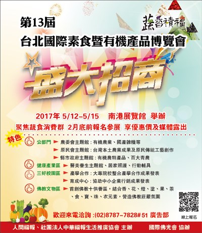 台北素博展盛大招商 |2017.02.17 語音朗讀 1316觀看次 字級 大 中 小 台北素博展盛大招商 第13屆台北國際素食暨有機產品博覽會5/12~5/15於南港展覽館舉辦。 前一篇文章 訂閱福報 下一篇文章 索取福報 熱門新聞 01秋節送暖 佛光人進光復祝福2025.10.0902三好校園化身賑災物資中心 菲師生協助包裝2025.10.0903響應零飢餓 日光寺廣贈公益米2025.10.1004星雲大師全集【講演集】佛教與青年—佛教青年 成功立業之道 2-12025.10.0905佛光山大明寺、宏法社 獲頒苗栗縣績優宗教團體2025.10.1006VEGRUN正念路跑 法寶寺攜手竹市府2025.10.0907車速表 準確性如何?2025.10.0908時速表為何要有誤差?2025.10.0909警攔違規自駕車 沒駕駛無法開單2025.10.0910貓咪神奇U型躺 像玩切割魔術2025.10.09 訂閱電子報 台北市 天氣預報 台灣一週天氣預報 相關報導 以文字護持人間福報運動睡眠新科技 養生保健新利器房仲第一品牌 永慶加薪3% 體驗美好手作 製皂幸福時光 博愛社大春季班招生中 薩克斯風吹奏春季班 人間大學台中分校招生中 跨越十年縱橫南半球到北半球 《行者》新書上市