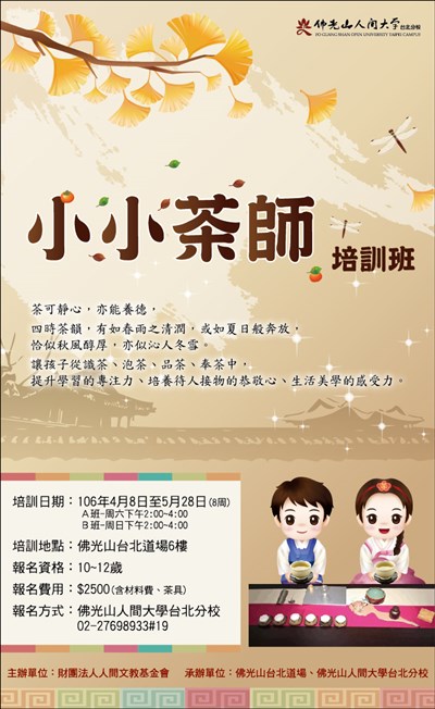 小小茶師培訓班 |2017.02.19 語音朗讀 305觀看次 字級 大 中 小 小小茶師培訓班 報名資格:10~12歲 培訓日期:4/8~5/28 培訓地點:佛光山台北道場6樓 前一篇文章 福報購專欄 下一篇文章 關懷贈報 熱門新聞 01中秋草地音樂會 祈願世界和平2025.10.0702秋節送暖 佛光人進光復祝福2025.10.0903星雲大師全集【講演集】禪學與淨土─禪師與禪詩 6-52025.10.0704拚日能源自給自足 高市力挺核能2025.10.0705三好校園化身賑災物資中心 菲師生協助包裝2025.10.0906西藏珠峰突降暴雪 傳近千人受困2025.10.0707新馬寺佛光普照 大馬民眾慶中秋2025.10.0708曼城佛光山贈圖典 愛丁堡大學典藏2025.10.0709光復鄉重災區4校 今全面復課2025.10.0710【詩】 秋水渡2025.10.07 訂閱電子報 台北市 天氣預報 台灣一週天氣預報 相關報導 以文字護持人間福報運動睡眠新科技 養生保健新利器房仲第一品牌 永慶加薪3% 體驗美好手作 製皂幸福時光 博愛社大春季班招生中 薩克斯風吹奏春季班 人間大學台中分校招生中 跨越十年縱橫南半球到北半球 《行者》新書上市