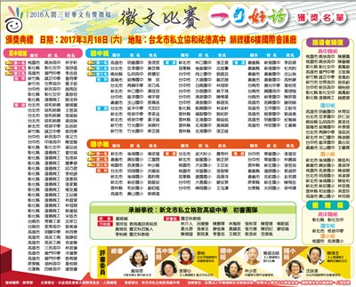 一句好話徵文比賽 |2017.02.22 語音朗讀 1086觀看次 字級 大 中 小 一句好話徵文比賽獲獎名單出爐 頒獎典禮將於3月18日,在台北市私立協和佑德高中韻鏗樓6樓國際會議廳舉行。 前一篇文章 福報購專欄 下一篇文章 我從山中來 沉香會館 熱門新聞 01陸建匈塞鐵路 塞國段全線通車2025.10.0502全球佛光人 雲端共識和諧和平2025.10.0503埃及熱氣球映門農巨像2025.10.0504以愛育才 20教師獲頒星雲教育獎2025.10.0505菲律賓宿霧強震 佛光人馳援賑災2025.10.0606高市早苗 電視台主播邁向首相寶座2025.10.0507虎頭埤風景區 推動纜車BOT案2025.10.0508心保和尚闡述《八大人覺經》修行是生命最好的投資 2025.10.0509【修行在人間】佛心的慈視52025.10.0510【人間行者心】感恩茶會 一場殊勝的相遇2025.10.05 訂閱電子報 台北市 天氣預報 台灣一週天氣預報 相關報導 以文字護持人間福報運動睡眠新科技 養生保健新利器房仲第一品牌 永慶加薪3% 體驗美好手作 製皂幸福時光 博愛社大春季班招生中 薩克斯風吹奏春季班 人間大學台中分校招生中 跨越十年縱橫南半球到北半球 《行者》新書上市
