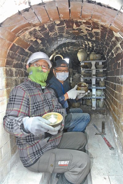 【本報台中訊】美麗自己的家鄉!新社區福興社區認養廢棄垃圾場造林,就地建置「材燒窯」,燒五天四夜由居民二十四小時輪流顧火,昨開窯取出二、三百件的咖啡杯、酒甕、盤子等,居民興奮拿起陶碗盛米粉用餐,捧著醞釀出的心血結晶,感動直呼「好吃」。