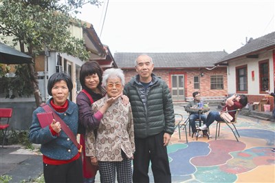 邱美智(左二)兄妹為了陪伴九十歲的老母親,發動家族成員把三合院彩繪成美美的。