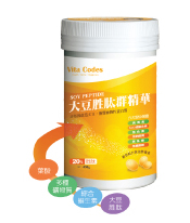Vita Codes大豆胜肽群精華,嚴選非基因改造大豆,透過高科技酵素水解技術,將大分子的蛋白質,分解成小分子的胜肽,快速、簡便、高效能補充宛如黃金般珍貴的優質營養素,營養全方位,通過多項SGS安檢認證。此外,還添加豐富礦物質、多種維生素和葉酸,營養多元、完整、好吸收,提供優質蛋白質的必需胺基酸,少了動物性蛋白質高脂肪、高膽固醇的風險,適合消化障礙、手術化療調養、孕期產後婦女、成長中孩童及銀髮族作為營養補充。