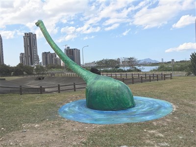 華中河濱公園內也新增有如從地面伸長脖子的超大腕龍,籃球場的籃板也被恐龍占據,有的恐龍啃咬籃框、有的恐龍則像被籃框套住頭,趣味橫生。