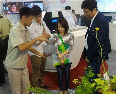 建中生在智慧城市展的市府展區「現身說法」,展現「永續的餐桌」概念。圖/中央社