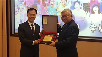 連江縣長劉增應(左)感謝母校北醫大栽培,更以身為北醫人為榮,右為北醫校長閻雲。圖/馮靖惠
