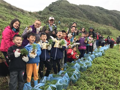 10多年前校方在通往燈塔的步道復育百合,還是被採光。師生今天種下千株百合,六年級陳郁嫻很擔心,種下的百合是否能平安長大,開花吐芬芳。小朋友把百合花種子放在手心,讓它們隨風飛去,再爬上陡峭的山坡,把花苗種下。