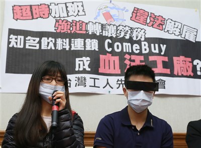 【本報台北訊】今年上路的一例一休,加重企業休息日加班費負擔,也出現第一個企業「A地工作、B地加班」違法案例。台灣工人先鋒協會年初陸續接到知名連鎖飲料店COMEBUY(長沂國際實業有限公司)工作的員工申訴,指COMEBUY強迫員工簽署合約,將超過8個小時的加班工時,以及假日加班的工時,轉移到名為「威顧集團」的第3方公司,規避勞基法加班費。