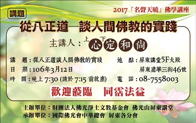 「名聲天曉」佛學講座 |2017.03.05 語音朗讀 384觀看次 字級 大 中 小 「名聲天曉」佛學講座 時間:3/12晚上7時30分 地點:屏東講堂5樓大殿 前一篇文章 護國祈安 千人大悲懺祈福法會 下一篇文章 勝鬘書院招生 熱門新聞 01【分數之外】看見另一種英文2026.04.0802租賃車業者違法攬客 觀光署:最高罰200萬元2026.04.0703清明豪雨 合歡溪出現新堰塞湖2026.04.0904杉林溪園區 紫藤花盛開2026.04.0805計程車掛牌費喊到35萬元 交部出手2026.04.0806火金姑故鄉 賞螢好去處2026.04.0907哥國動盪城 變身世界圖書之都2026.04.0808【練瑜伽品生活】英雄式二 英雄不能只看正面2026.04.0809美伊談判 45天停火協議2026.04.0710吃素也能大補「鐵」 開心果芝麻含量豐2026.04.08 訂閱電子報 台北市 天氣預報 台灣一週天氣預報 相關報導 以文字護持人間福報運動睡眠新科技 養生保健新利器房仲第一品牌 永慶加薪3% 體驗美好手作 製皂幸福時光 博愛社大春季班招生中 薩克斯風吹奏春季班 人間大學台中分校招生中 跨越十年縱橫南半球到北半球 《行者》新書上市