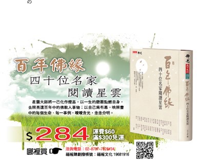福報購商品介紹 |2017.03.07 語音朗讀 1508觀看次 字級 大 中 小 百年佛緣:四十位名家閱讀星雲 星雲大師將一己化作燈蕊,以一生的磨難點燃自身,去照亮這百年中的佛教人事物;以自己為布幕,映照書中的每個生命、每一事例,曖曖含光,念念分明。 前一篇文章 樹王檜木精油 獲發明專利競賽金牌獎 下一篇文章 福慧焦點 六種助緣 熱門新聞 01【分數之外】看見另一種英文2026.04.0802降雨兩樣情 南部水庫沒解渴2026.04.0603MLB鄧愷威拆彈 守住今井旅美首勝2026.04.0604租賃車業者違法攬客 觀光署:最高罰200萬元2026.04.0705清明豪雨 合歡溪出現新堰塞湖2026.04.0906杉林溪園區 紫藤花盛開2026.04.0807計程車掛牌費喊到35萬元 交部出手2026.04.0808火金姑故鄉 賞螢好去處2026.04.0909哥國動盪城 變身世界圖書之都2026.04.0810【練瑜伽品生活】英雄式二 英雄不能只看正面2026.04.08 訂閱電子報 台北市 天氣預報 台灣一週天氣預報 相關報導 以文字護持人間福報運動睡眠新科技 養生保健新利器房仲第一品牌 永慶加薪3% 體驗美好手作 製皂幸福時光 博愛社大春季班招生中 薩克斯風吹奏春季班 人間大學台中分校招生中 跨越十年縱橫南半球到北半球 《行者》新書上市