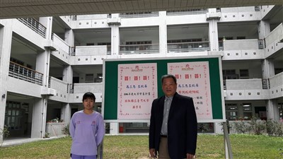 在普中老師悉心教導下,高三學生王欣屏(左)順利錄取台灣大學藥學系,普門中學代理校長蔡國權與全校同仁都與有榮焉。圖/普中提供