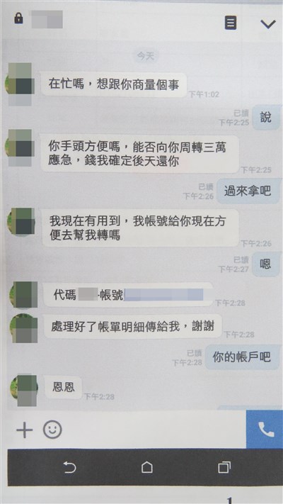 警方分析,LINE的冒名詐騙案件頻傳,多半是借錢、匯款的要求,直接打電話求證,才是最保險的。