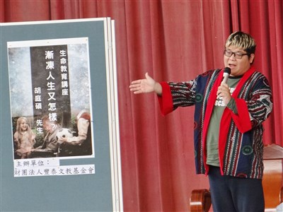【本報雲林訊】學測滿級分,又成功創業的漸凍人胡庭碩,今天應豐泰文教基金會邀請到雲林偏鄉褒忠國中演講,全鄉國中小學生到場聆聽他分享如何從跌撞一生,重新站起來的心路歷程,他說,殘障不僅要樂觀進取,「找方法」才是邁向新人生的出口。他以此勉勵所有同學,如何從不好變成好,再從好進而有能力與人「共好」。